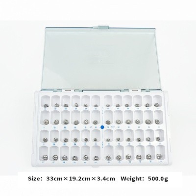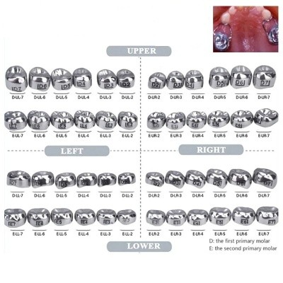 Dental Kid Primary Molar Crown Quantity:1/2kits 1 kit=48 pcs,1pc of each size Material: Stainless Steel There are 48 different sizes of the crown. The meaning of the D is 1st molar The meaning of the E is 2nd molar The meaning of the U and L are upper and lower L and R are left side and right side The number is size of the crown